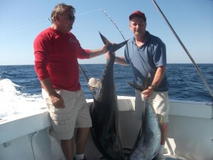 and hold until late march. This means only clear skies and great fishing. We have several boat to choose from one of the best is Dos Amigos spacious 40′ sports fisher completely tricked out for fishing and can accommodate you and your group in total comfort. Our boats are equipped with top of the line equipment ( Gold Penn), the latest electronics, sonar, radar, 2 radios, all safety equipment, flybridge, large galley with all the extras, bathroom- head, 2 fighting chairs, three live wells, teasers, tuna tubes, down riggers, lures, live/dead bait and 10 lines for trolling. We have gold penn 965 bait casters ( 12 lb line ) to gold penn 80’s two speed reels with ( 80 lb.line ). I also have gold penn fly gear for fishing for the big ones witthe h super light tackle.
